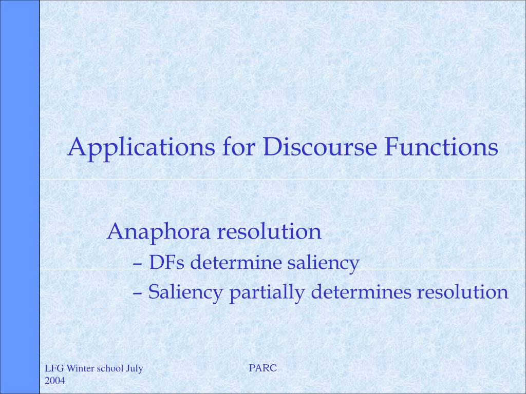 Applications for Discourse Functions Anaphora resolution • DFs determine saliency • Saliency partially determines resolution PARC