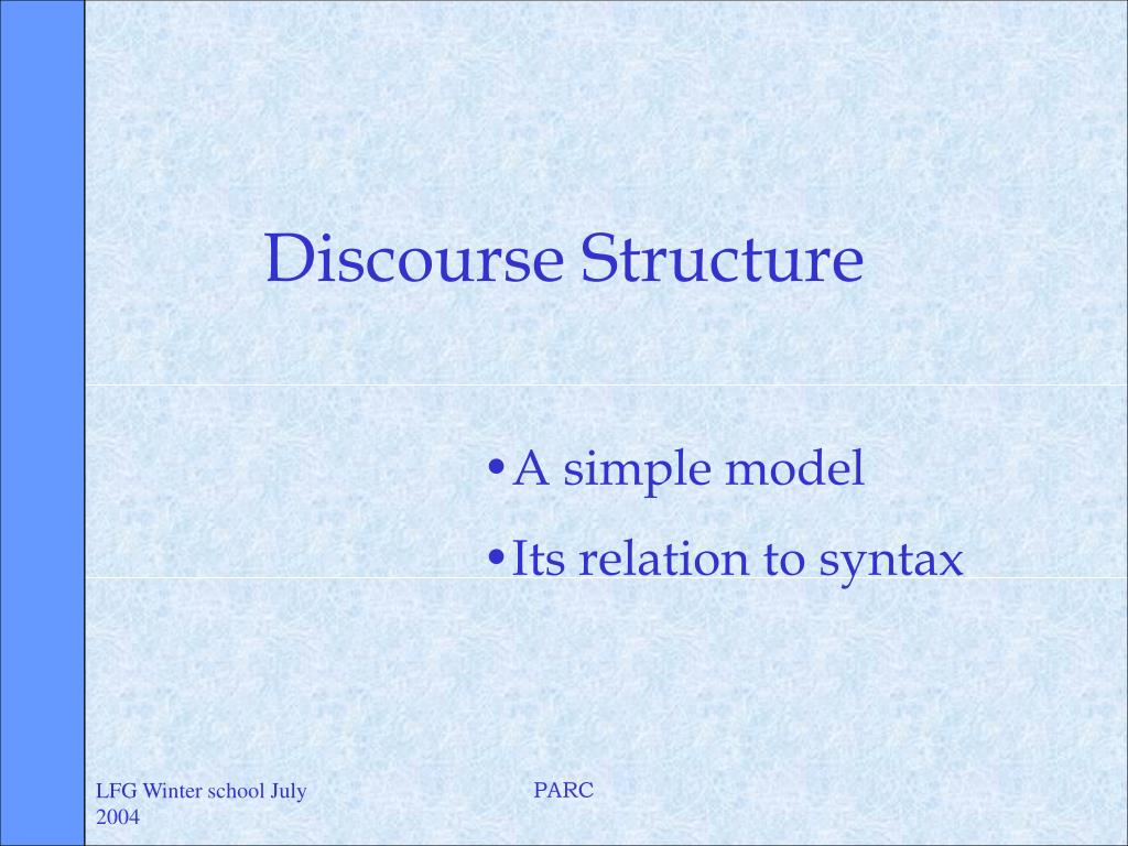 Discourse Structure • A simple model • Its relation to syntax PARC