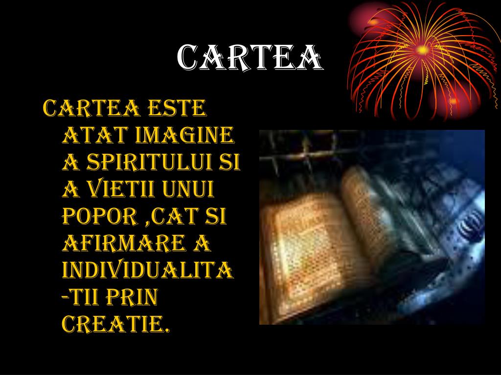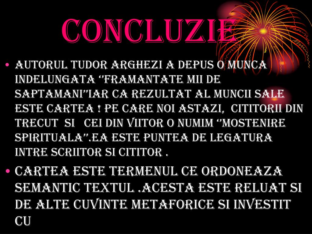 concluzie • autorul tudor arghezi a depus o munca indelungata ‘’framantate mii de saptamani’’iar ca rezultat al muncii sale este cartea ! pe care noi astazi, cititorii din trecut si cei din viitor o numim ‘’mostenire spirituala’’.ea este puntea de legatura intre scriitor si cititor . • cartea este termenul ce ordoneaza semantic textul .acesta este reluat si de alte cuvinte metaforice si investit cu