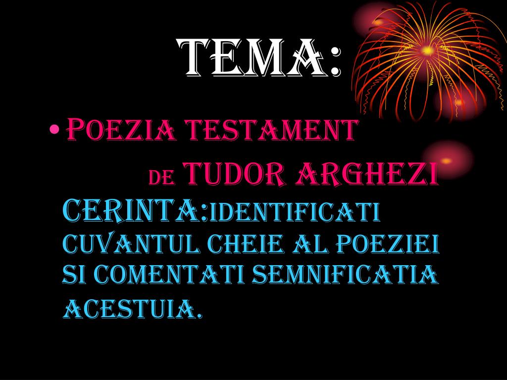 TEMA: • POEZIA TESTAMENT DETUDOR ARGHEZI CERINTA:IDENTIFICATI CUVANTUL CHEIE AL POEZIEI SI COMENTATI SEMNIFICATIA ACESTUIA.