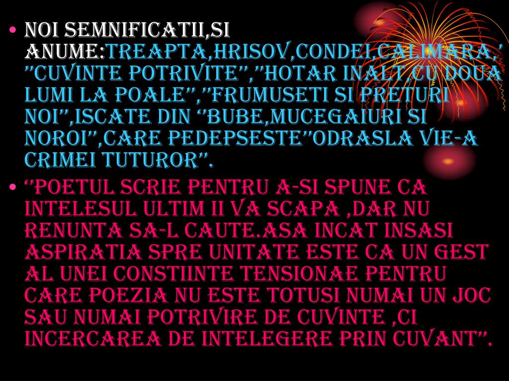 noi semnificatii,si anume:treapta,hrisov,condei,calimara,’’’cuvinte potrivite’’,’’hotar inalt,cu doua lumi la poale’’,’’frumuseti si preturi noi’’,iscate din ‘’bube,mucegaiuri si noroi’’,care pedepseste’’odrasla vie-a crimei tuturor’’. • ‘’poetul scrie pentru a-si spune ca intelesul ultim ii va scapa ,dar nu renunta sa-l caute.asa incat insasi aspiratia spre unitate este ca un gest al unei constiinte tensionae pentru care poezia nu este totusi numai un joc sau numai potrivire de cuvinte ,ci incercarea de intelegere prin cuvant’’.