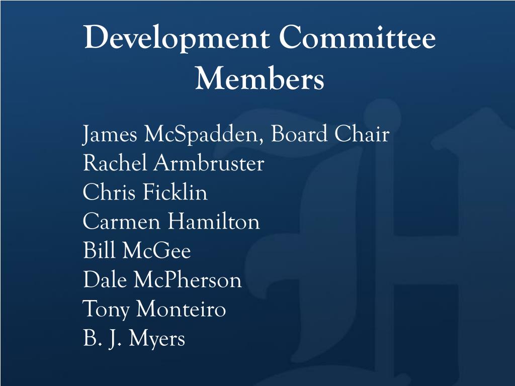 Development Committee Members James McSpadden, Board Chair Rachel Armbruster Chris Ficklin Carmen Hamilton Bill McGee Dale McPherson Tony Monteiro B. J. Myers