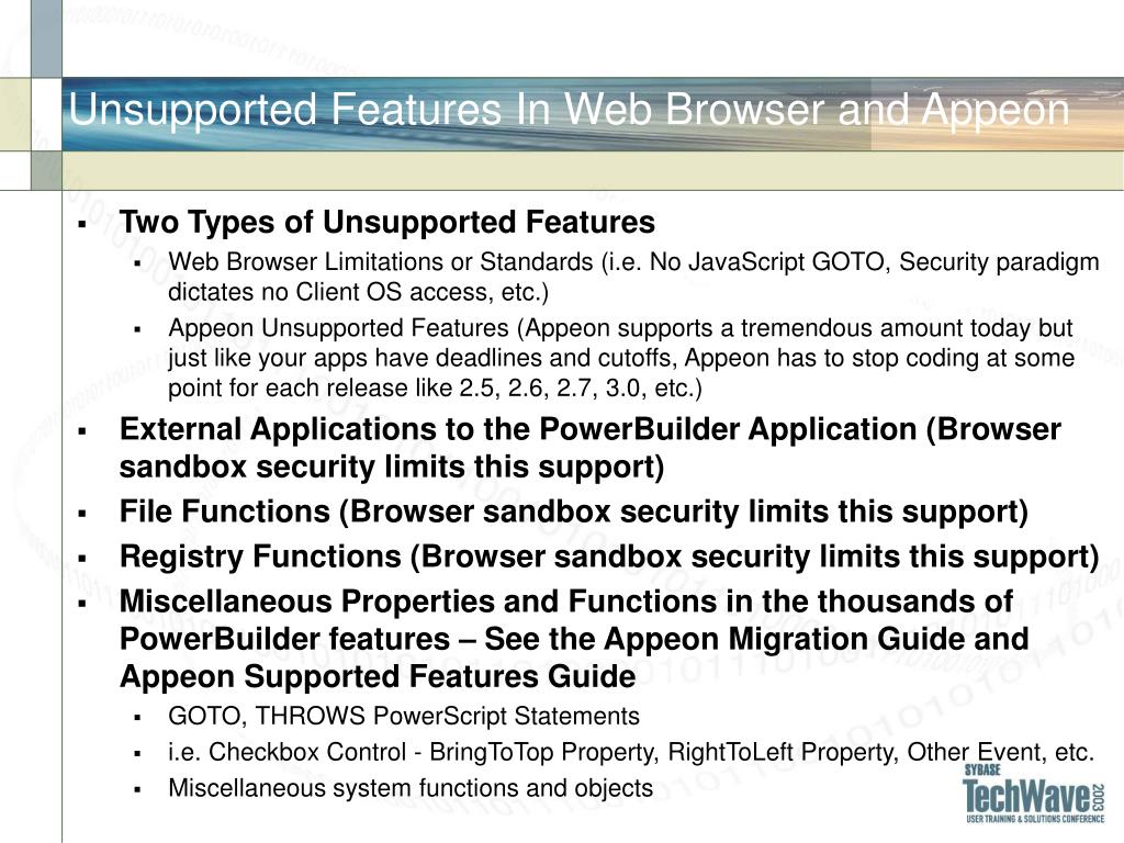Unsupported Features In Web Browser and Appeon • Two Types of Unsupported Features • Web Browser Limitations or Standards (i.e. No JavaScript GOTO, Security paradigm dictates no Client OS access, etc.) • Appeon Unsupported Features (Appeon supports a tremendous amount today but just like your apps have deadlines and cutoffs, Appeon has to stop coding at some point for each release like 2.5, 2.6, 2.7, 3.0, etc.) • External Applications to the PowerBuilder Application (Browser sandbox security limits this support) • File Functions (Browser sandbox security limits this support) • Registry Functions (Browser sandbox security limits this support) • Miscellaneous Properties and Functions in the thousands of PowerBuilder features – See the Appeon Migration Guide and Appeon Supported Features Guide • GOTO, THROWS PowerScript Statements • i.e. Checkbox Control - BringToTop Property, RightToLeft Property, Other Event, etc. • Miscellaneous system functions and objects