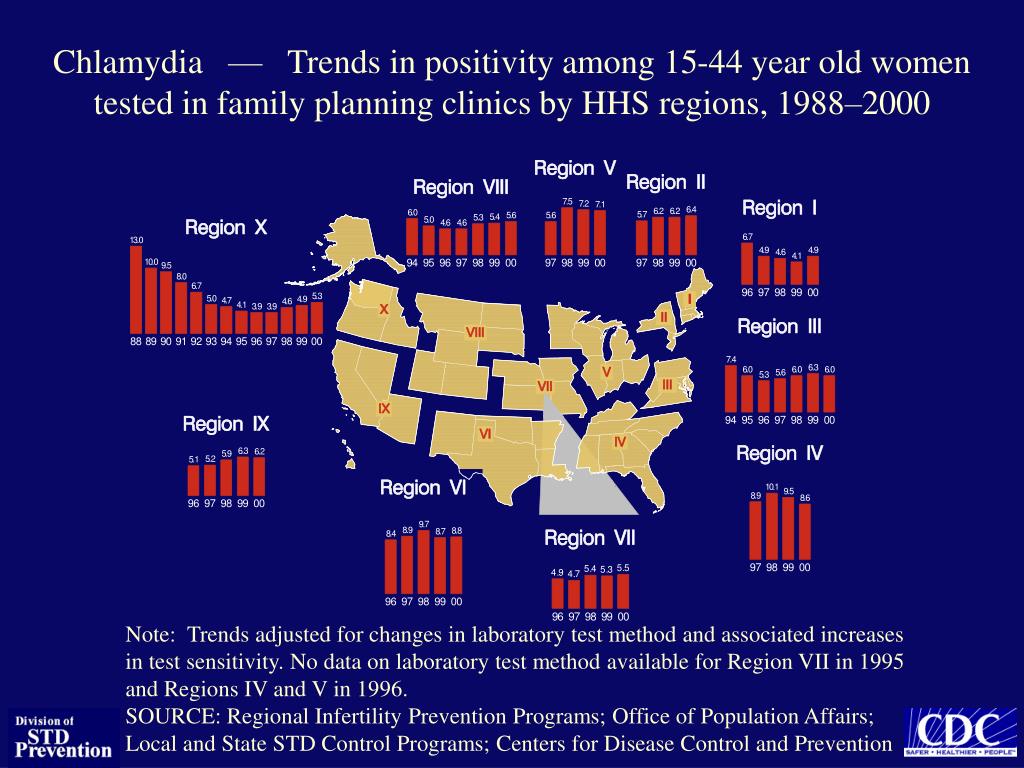 Chlamydia — Trends in positivity among 15-44 year old women tested in family planning clinics by HHS regions, 1988–2000 Note: Trends adjusted for changes in laboratory test method and associated increases in test sensitivity. No data on laboratory test method available for Region VII in 1995 and Regions IV and V in 1996. SOURCE: Regional Infertility Prevention Programs; Office of Population Affairs; Local and State STD Control Programs; Centers for Disease Control and Prevention