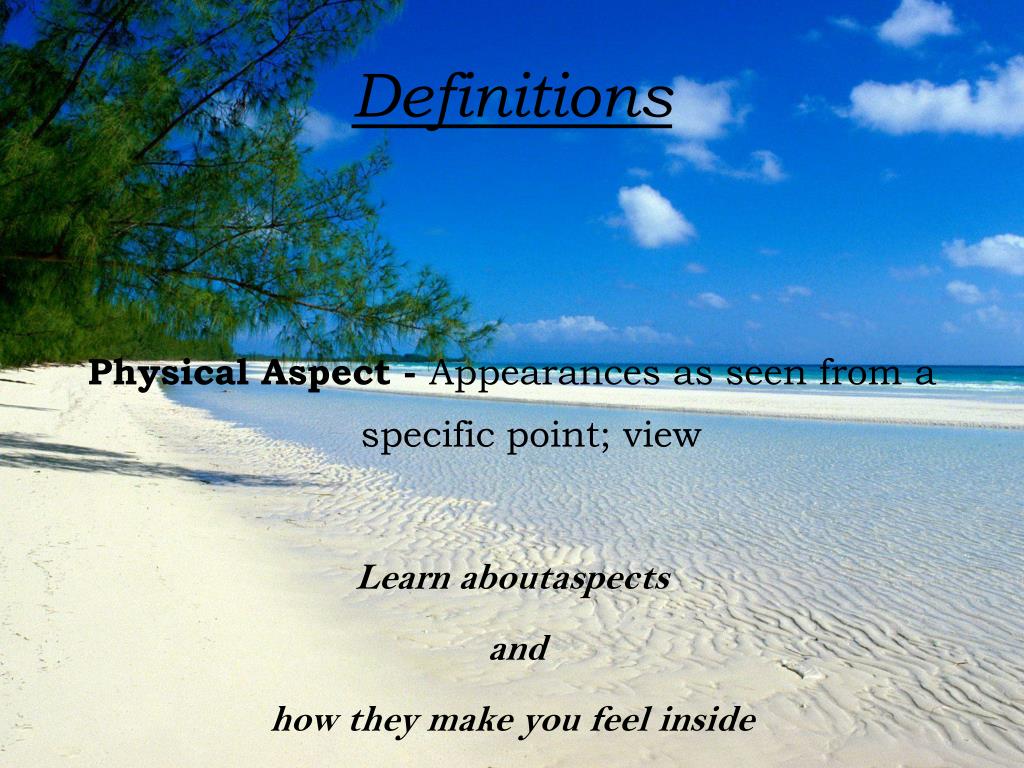 Definitions Physical Aspect - Appearances as seen from a specific point; view Learn aboutaspects and how they make you feel inside