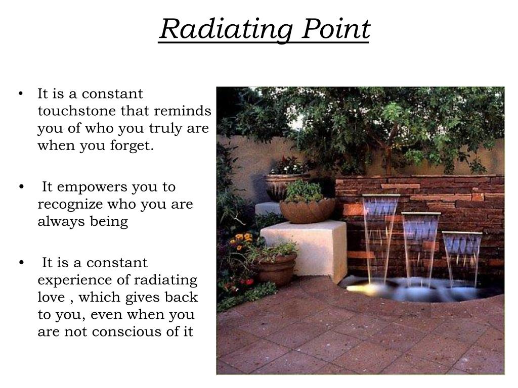 Radiating Point • It is a constant touchstone that reminds you of who you truly are when you forget. • It empowers you to recognize who you are always being • It is a constant experience of radiating love , which gives back to you, even when you are not conscious of it