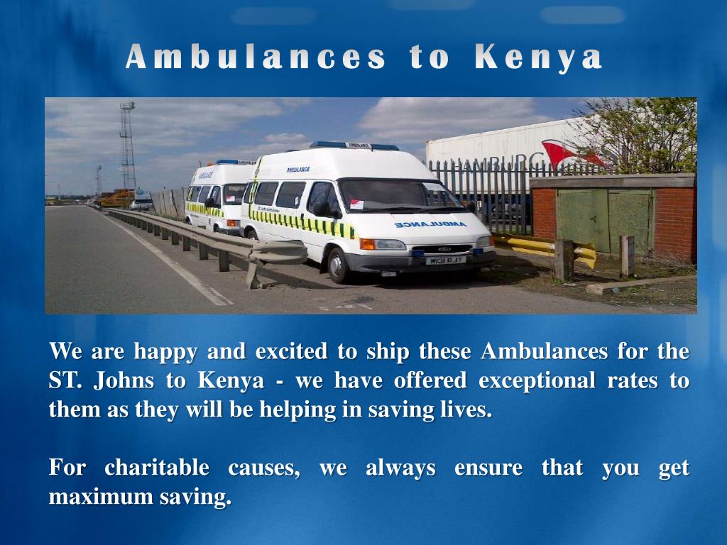 Ambulances to Kenya We are happy and excited to ship these Ambulances for the ST. Johns to Kenya - we have offered exceptional rates to them as they will be helping in saving lives. For charitable causes, we always ensure that you get maximum saving.