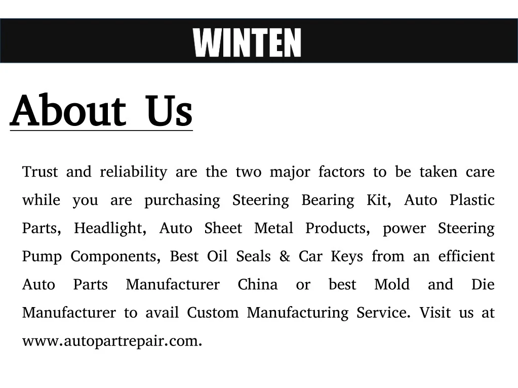 About Us Trust and reliability are the two major factors to be taken care while you are purchasing Steering Bearing Kit, Auto Plastic Parts, Headlight, Auto Sheet Metal Products, power Steering Pump Components, Best Oil Seals & Car Keys from an efficient Auto Parts Manufacturer China or best Mold and Die Manufacturer to avail Custom Manufacturing Service. Visit us at www.autopartrepair.com.