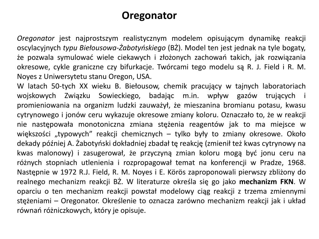 Oregonator Oregonator jest najprostszym realistycznym modelem opisującym dynamikę reakcji oscylacyjnych typu Biełousowa-Żabotyńskiego (BŻ). Model ten jest jednak na tyle bogaty, że pozwala symulować wiele ciekawych i złożonych zachowań takich, jak rozwiązania okresowe, cykle graniczne czy bifurkacje. Twórcami tego modelu są R. J. Field i R. M. Noyes z Uniwersytetu stanu Oregon, USA. W latach 50-tych XX wieku B. Biełousow, chemik pracujący w tajnych laboratoriach wojskowych Związku Sowieckiego, badając m.in. wpływ gazów trujących i promieniowania na organizm ludzki zauważył, że mieszanina bromianu potasu, kwasu cytrynowego i jonów ceru wykazuje okresowe zmiany koloru. Oznaczało to, że w reakcji nie następowała monotoniczna zmiana stężenia reagentów jak to ma miejsce w większości „typowych” reakcji chemicznych – tylko były to zmiany okresowe. Około dekady później A. Żabotyński dokładniej zbadał tę reakcję (zmienił też kwas cytrynowy na kwas malonowy) i zasugerował, że przyczyną zmian koloru mogą być jonu ceru na różnych stopniach utlenienia i rozpropagował temat na konferencji w Pradze, 1968. Następnie w 1972 R.J. Field, R. M. Noyes i E. Körös zaproponowali pierwszy zbliżony do realnego mechanizm reakcji BŻ. W literaturze określa się go jako mechanizm FKN. W oparciu o ten mechanizm reakcji powstał modelowy ciąg reakcji z trzema zmiennymi stężeniami – Oregonator. Określenie to oznacza zarówno mechanizm reakcji jak i układ równań różniczkowych, który je opisuje.