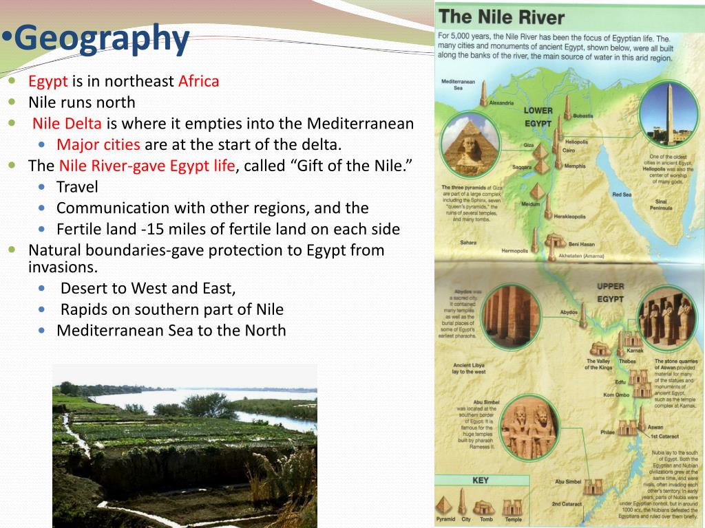 Geography • Egypt is in northeast Africa • Nile runs north • Nile Delta is where it empties into the Mediterranean • Major cities are at the start of the delta. • The Nile River-gave Egypt life, called “Gift of the Nile.” • Travel • Communication with other regions, and the • Fertile land -15 miles of fertile land on each side • Natural boundaries-gave protection to Egypt from invasions. • Desert to West and East, • Rapids on southern part of Nile • Mediterranean Sea to the North