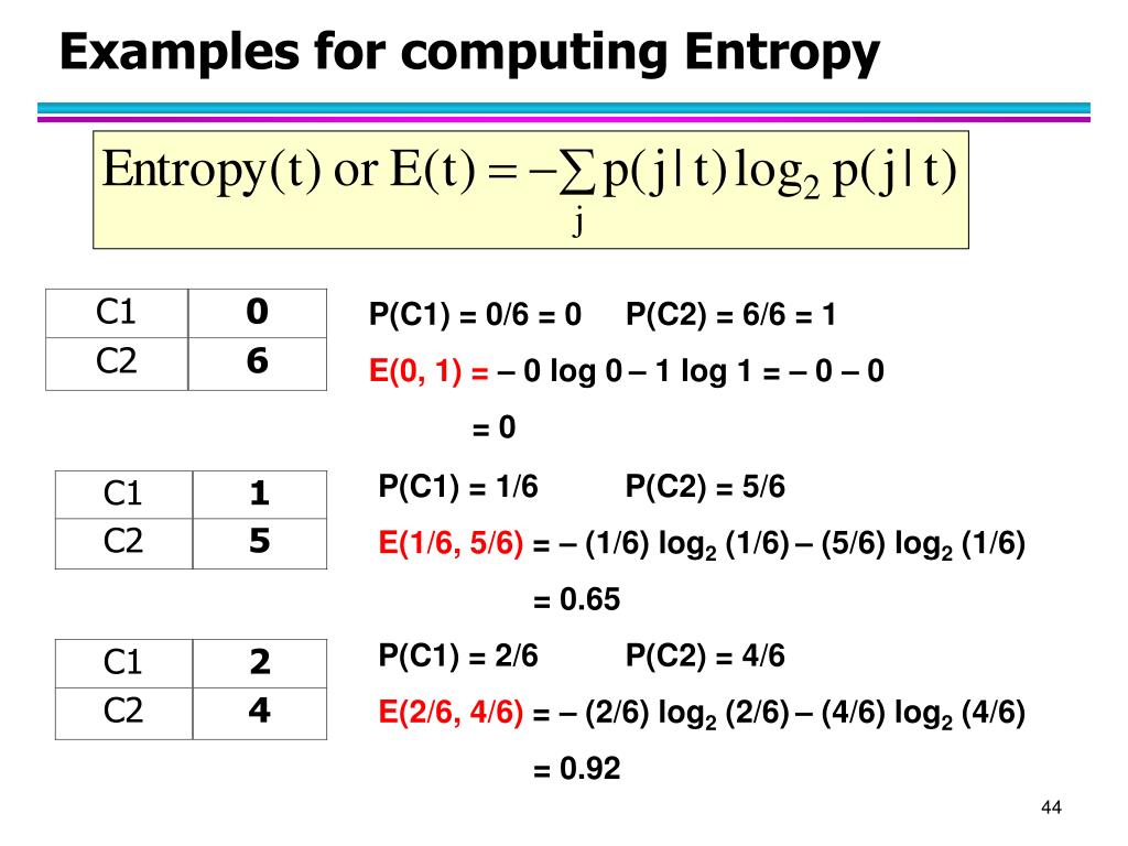 P(C1) = 2/6 P(C2) = 4/6 E(2/6, 4/6) = – (2/6) log2 (2/6)– (4/6) log2 (4/6) = 0.92 Examples for computing Entropy P(C1) = 0/6 = 0 P(C2) = 6/6 = 1 E(0, 1) = – 0 log 0– 1 log 1 = – 0 – 0 = 0 P(C1) = 1/6 P(C2) = 5/6 E(1/6, 5/6) = – (1/6) log2 (1/6)– (5/6) log2 (1/6) = 0.65