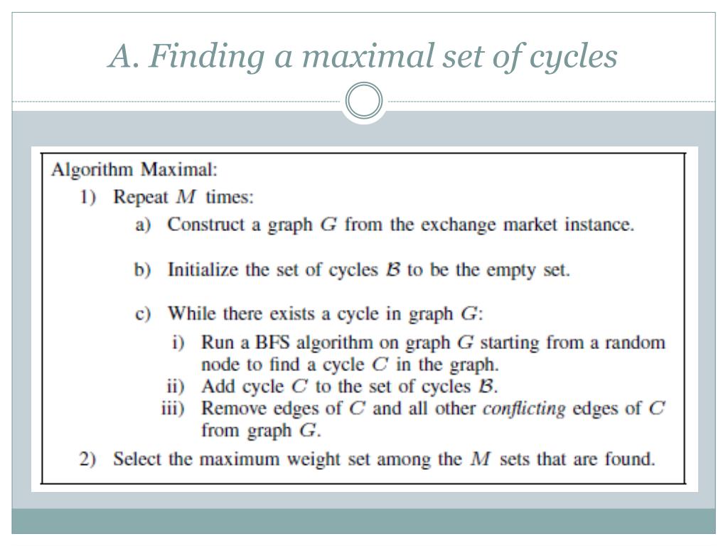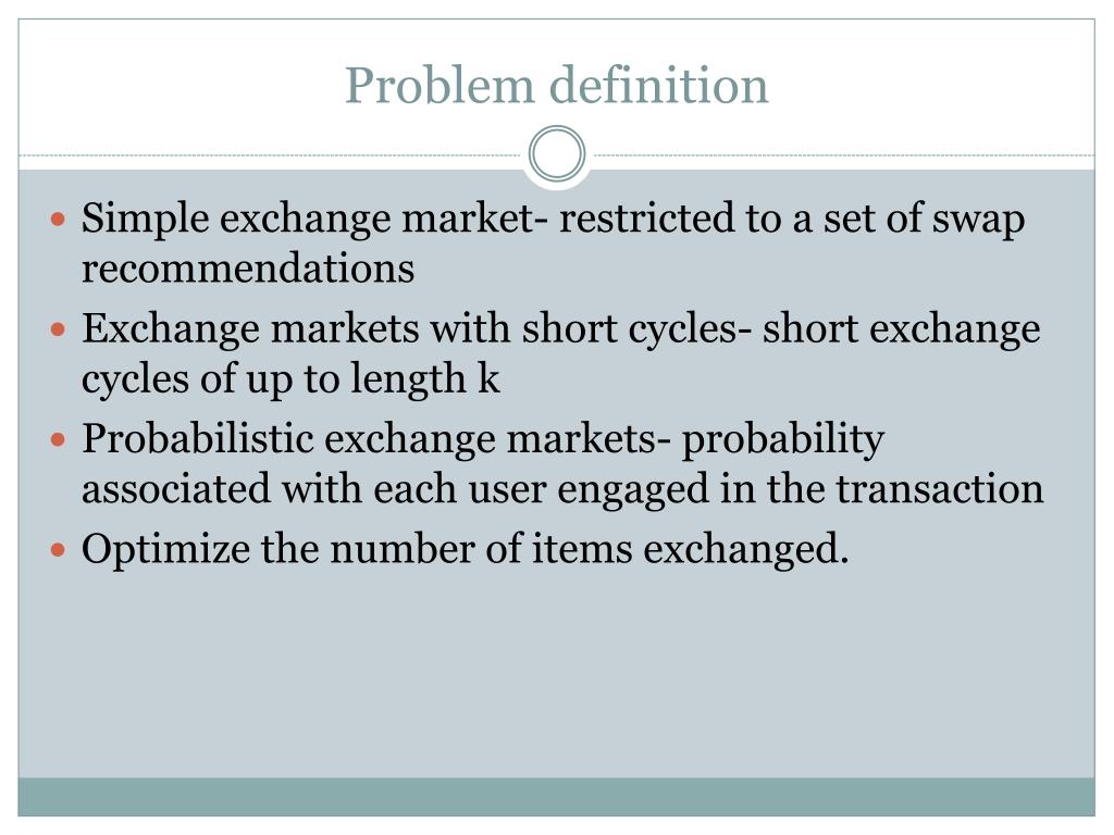 Problem definition Simple exchange market- restricted to a set of swap recommendations Exchange markets with short cycles- short exchange cycles of up to length k Probabilistic exchange markets- probability associated with each user engaged in the transaction Optimize the number of items exchanged.