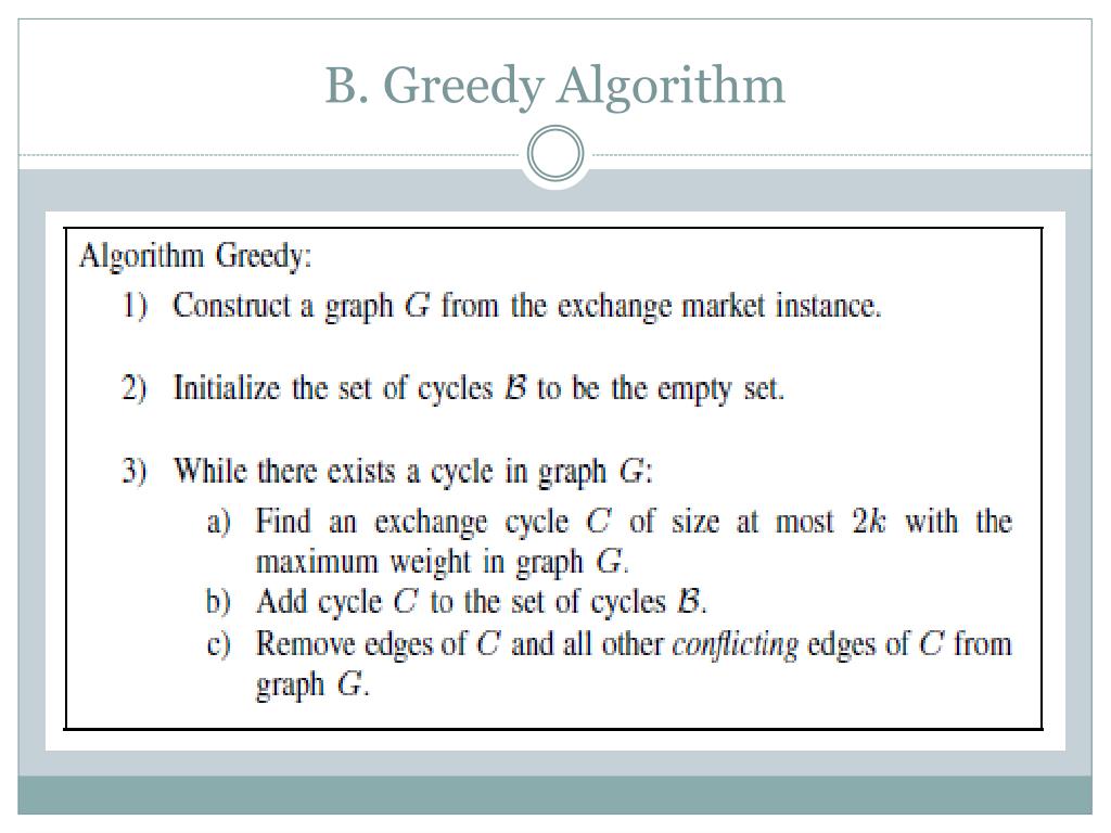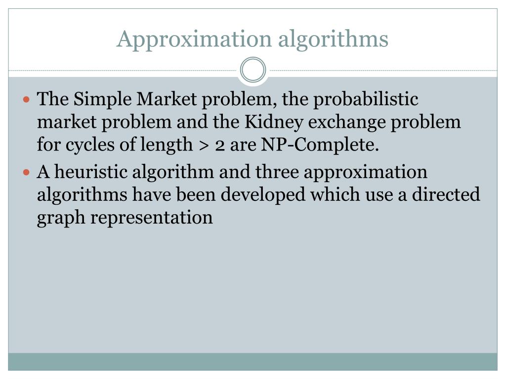 Approximation algorithms The Simple Market problem, the probabilistic market problem and the Kidney exchange problem for cycles of length > 2 are NP-Complete. A heuristic algorithm and three approximation algorithms have been developed which use a directed graph representation