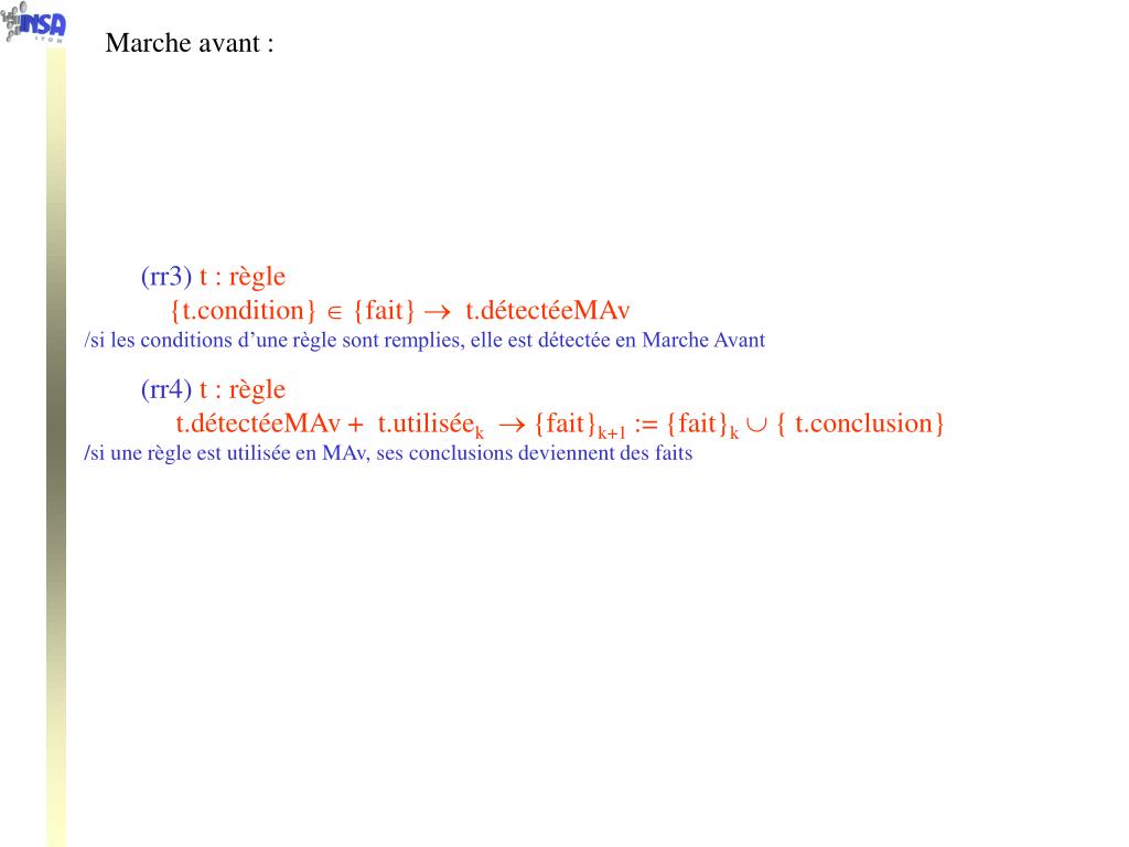 Marche avant : • (rr3) t : règle • {t.condition} {fait} t.détectéeMAv • /si les conditions d’une règle sont remplies, elle est détectée en Marche Avant • (rr4) t : règle • t.détectéeMAv + t.utiliséek{fait}k+1 := {fait}k{t.conclusion} • /si une règle est utilisée en MAv, ses conclusions deviennent des faits
