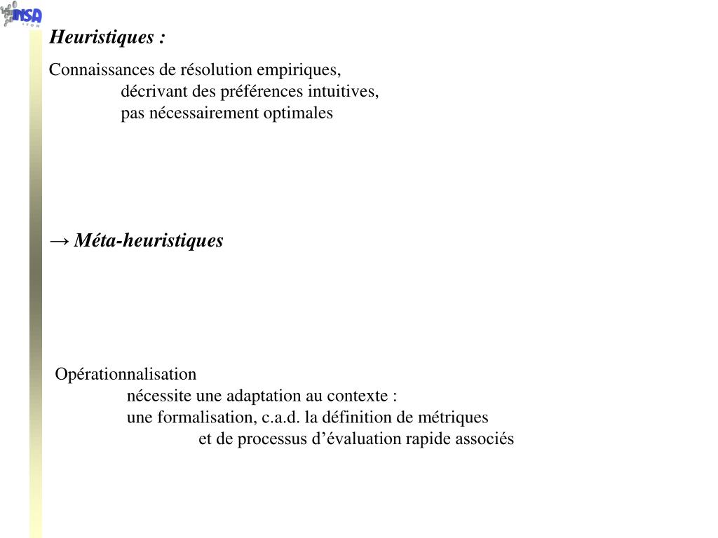 Heuristiques : Connaissances de résolution empiriques, décrivant des préférences intuitives, pas nécessairement optimales → Méta-heuristiques Opérationnalisation nécessite une adaptation au contexte : une formalisation, c.a.d. la définition de métriques et de processus d’évaluation rapide associés