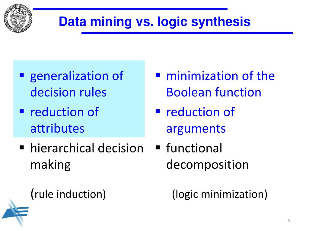 Data mining vs. logic synthesis • generalization of decision rules • reduction of attributes • hierarchical decision making • minimization of the Boolean function • reduction of arguments • functional decomposition (rule induction) (logic minimization)