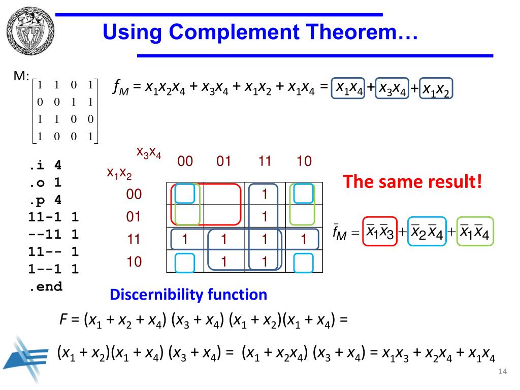 Using Complement Theorem… M: fM = x1x2x4 + x3x4 + x1x2 + x1x4 = x1x4 + x3x4 + x1x2 .i 4 .o 1 .p 4 11-1 1 --11 1 11-- 1 1--1 1 .end The same result! Discernibility function F = (x1 + x2 + x4) (x3 + x4) (x1 + x2)(x1 + x4) = (x1 + x2)(x1 + x4) (x3 + x4) = (x1 + x2x4) (x3 + x4) = x1x3+ x2x4 + x1x4