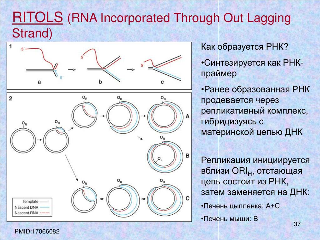 RITOLS(RNA Incorporated Through Out Lagging Strand) • Как образуется РНК? • Синтезируется как РНК-праймер • Ранее образованная РНК продевается через репликативный комплекс, гибридизуясь с материнской цепью ДНК • Репликация инициируется вблизи ORIH, отстающая цепь состоит из РНК, затем заменяется на ДНК: • Печень цыпленка: А+С • Печень мыши: В PMID:17066082