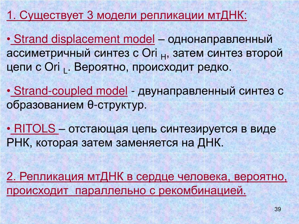 1. Существует 3 модели репликации мтДНК: • Strand displacement model – однонаправленный ассиметричный синтез с Ori Н, затем синтез второй цепи с Ori L. Вероятно, происходит редко. • Strand-coupled model - двунаправленный синтез с образованием θ-cтруктур. • RITOLS– отстающая цепь синтезируется в виде РНК, которая затем заменяется на ДНК. • 2. Репликация мтДНК в сердце человека, вероятно, происходит параллельно с рекомбинацией.