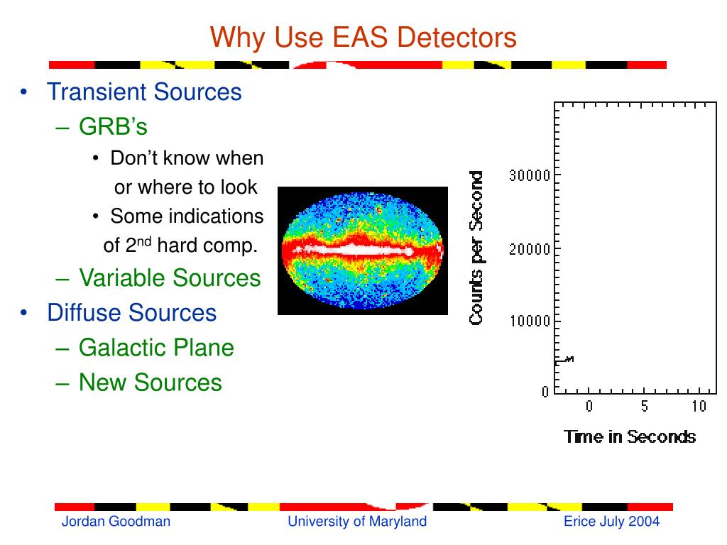 Why Use EAS Detectors • Transient Sources • GRB’s • Don’t know when or where to look • Some indications of 2nd hard comp. • Variable Sources • Diffuse Sources • Galactic Plane • New Sources University of Maryland
