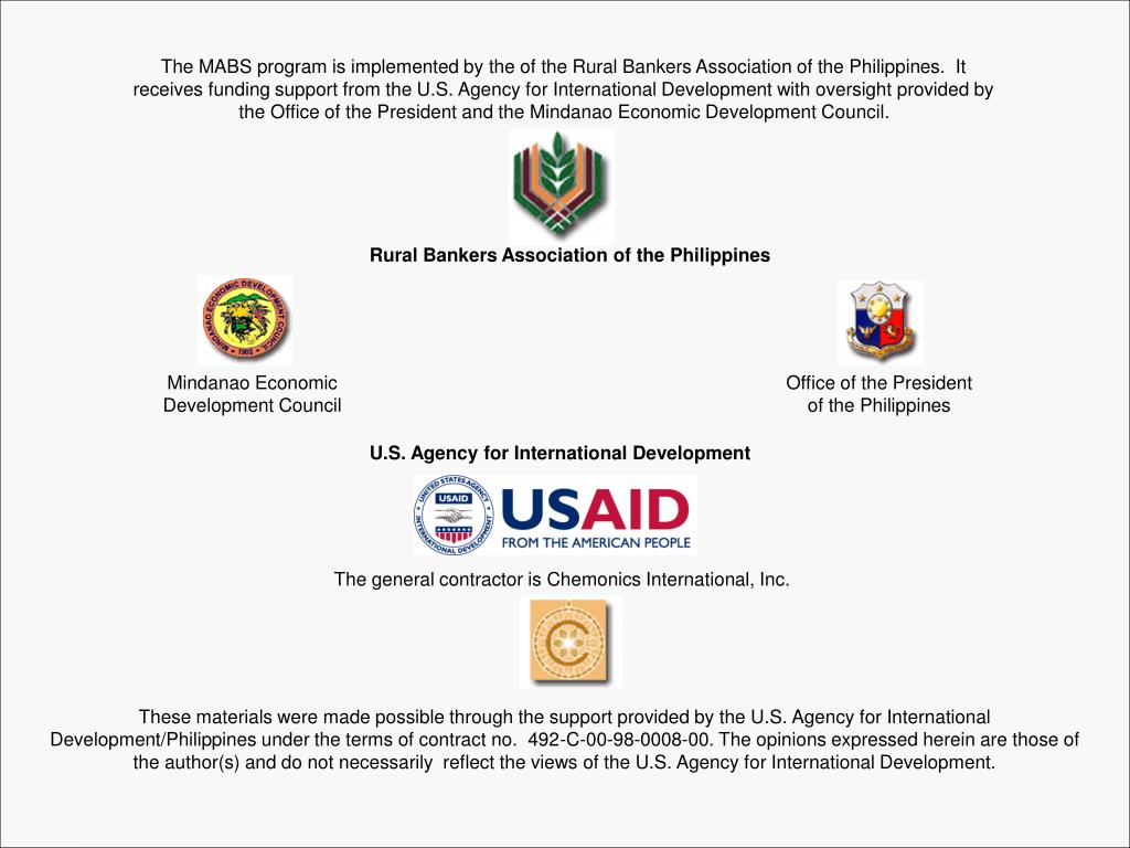 The MABS program is implemented by the of the Rural Bankers Association of the Philippines. It receives funding support from the U.S. Agency for International Development with oversight provided by the Office of the President and the Mindanao Economic Development Council. Rural Bankers Association of the Philippines Mindanao Economic Development Council Office of the President of the Philippines U.S. Agency for International Development The general contractor is Chemonics International, Inc. These materials were made possible through the support provided by the U.S. Agency for International Development/Philippines under the terms of contract no. 492-C-00-98-0008-00. The opinions expressed herein are those of the author(s) and do not necessarily reflect the views of the U.S. Agency for International Development.