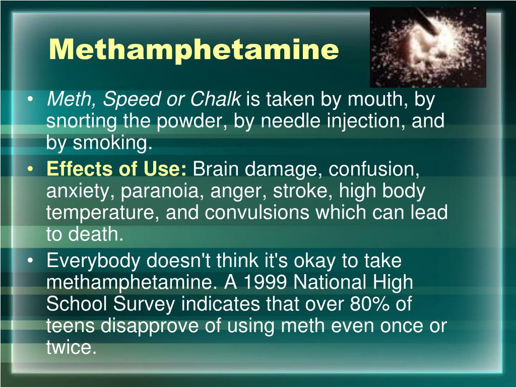 Methamphetamine • Meth, Speed or Chalk is taken by mouth, by snorting the powder, by needle injection, and by smoking. • Effects of Use: Brain damage, confusion, anxiety, paranoia, anger, stroke, high body temperature, and convulsions which can lead to death. • Everybody doesn't think it's okay to take methamphetamine. A 1999 National High School Survey indicates that over 80% of teens disapprove of using meth even once or twice.