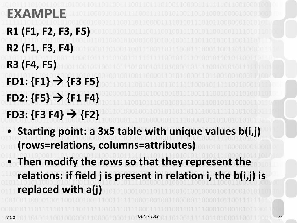 EXAMPLE R1 (F1, F2, F3, F5) R2 (F1, F3, F4) R3 (F4, F5) FD1: {F1} {F3 F5} FD2: {F5} {F1 F4} FD3: {F3 F4} {F2} • Starting point: a 3x5 table with unique values b(i,j) (rows=relations, columns=attributes) • Then modify the rows so that they represent the relations: if field j is present in relation i, the b(i,j) is replaced with a(j) OE NIK 2013
