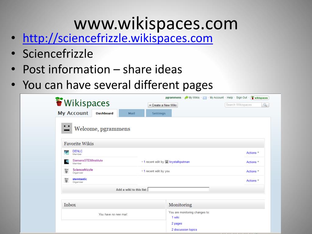 www.wikispaces.com • http://sciencefrizzle.wikispaces.com • Sciencefrizzle • Post information – share ideas • You can have several different pages