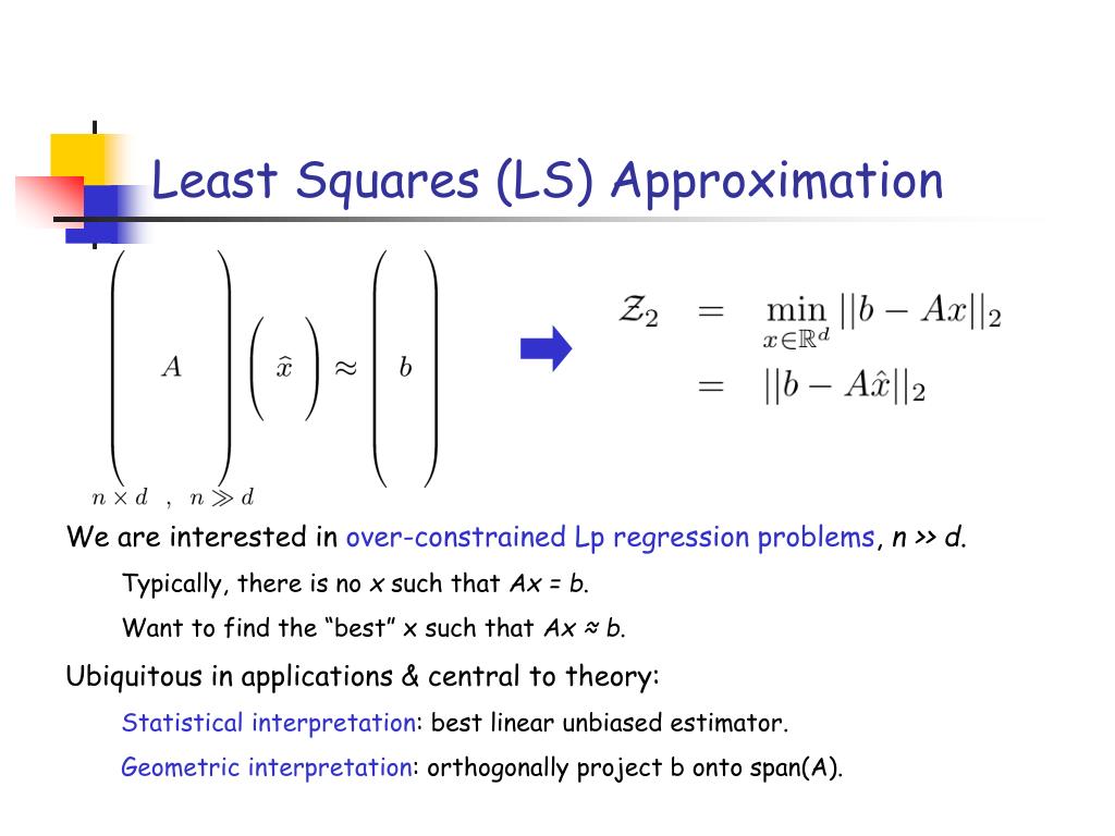 Least Squares (LS) Approximation We are interested in over-constrained Lp regression problems, n >> d. Typically, there is no x such that Ax = b. Want to find the “best” x such that Ax ≈ b. Ubiquitous in applications & central to theory: Statistical interpretation: best linear unbiased estimator. Geometric interpretation: orthogonally project b onto span(A).