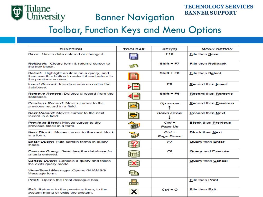 Technology ServicesBanner Support Banner NavigationToolbar, Function Keys and Menu Options