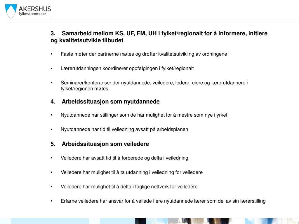 3. Samarbeid mellom KS, UF, FM, UH i fylket/regionalt for å informere, initiere og kvalitetsutvikle tilbudet • Faste møter der partnerne møtes og drøfter kvalitetsutvikling av ordningene • Lærerutdanningen koordinerer oppfølgingen i fylket/regionalt • Seminarer/konferanser der nyutdannede, veiledere, ledere, eiere og lærerutdannere i fylket/regionen møtes • Nyutdannede har stillinger som de har mulighet for å mestre som nye i yrket • Nyutdannede har tid til veiledning avsatt på arbeidsplanen • Veiledere har avsatt tid til å forberede og delta i veiledning • Veiledere har mulighet til å ta utdanning i veiledning for veiledere • Veiledere har mulighet til å delta i faglige nettverk for veiledere • Erfarne veiledere har ansvar for å veilede flere nyutdannede lærer som del av sin lærerstilling • 4. Arbeidssituasjon som nyutdannede • 5. Arbeidssituasjon som veiledere