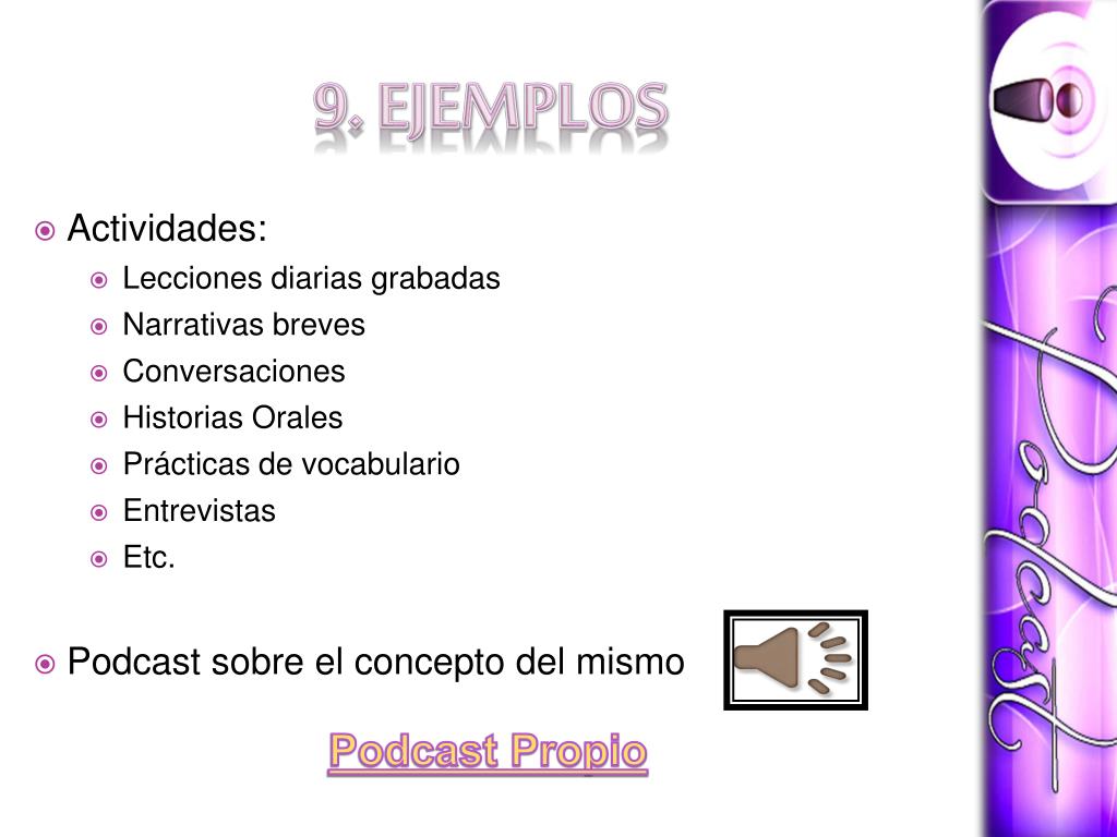 9. EJEMPLOS • Actividades: • Lecciones diarias grabadas • Narrativas breves • Conversaciones • Historias Orales • Prácticas de vocabulario • Entrevistas • Etc. • Podcast sobre el concepto del mismo Podcast Propio
