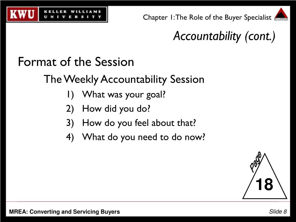 Chapter 1: The Role of the Buyer Specialist Accountability (cont.) Format of the Session The Weekly Accountability Session • What was your goal? • How did you do? • How do you feel about that? • What do you need to do now? 18