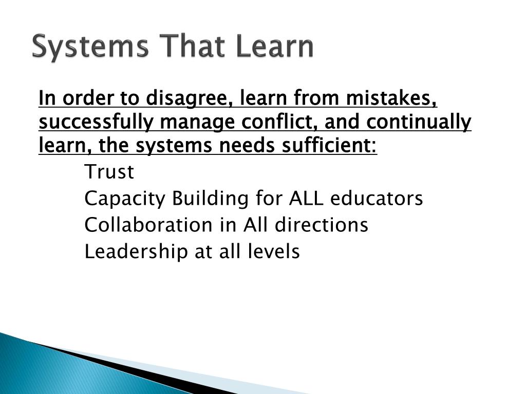 Systems That Learn In order to disagree, learn from mistakes, successfully manage conflict, and continually learn, the systems needs sufficient: Trust Capacity Building for ALL educators Collaboration in All directions Leadership at all levels