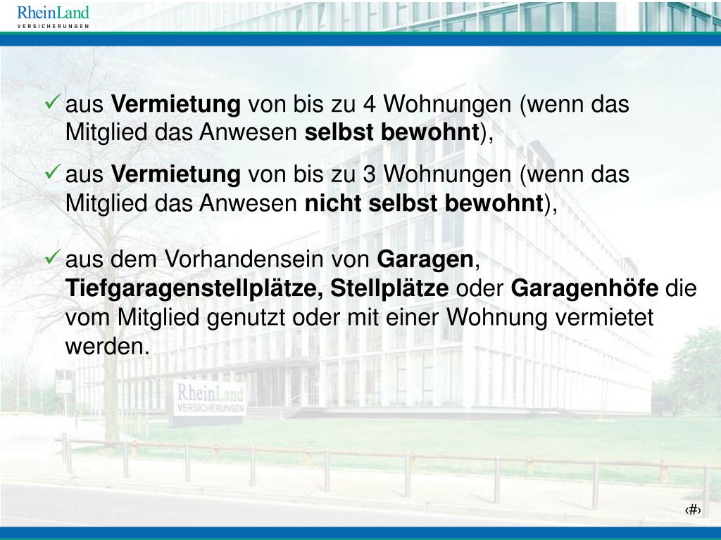 aus Vermietung von bis zu 3 Wohnungen (wenn das Mitglied das Anwesen nicht selbst bewohnt), • aus Vermietung von bis zu 4 Wohnungen (wenn das Mitglied das Anwesen selbst bewohnt), • aus dem Vorhandensein von Garagen, Tiefgaragenstellplätze, Stellplätze oder Garagenhöfe die vom Mitglied genutzt oder mit einer Wohnung vermietet werden.