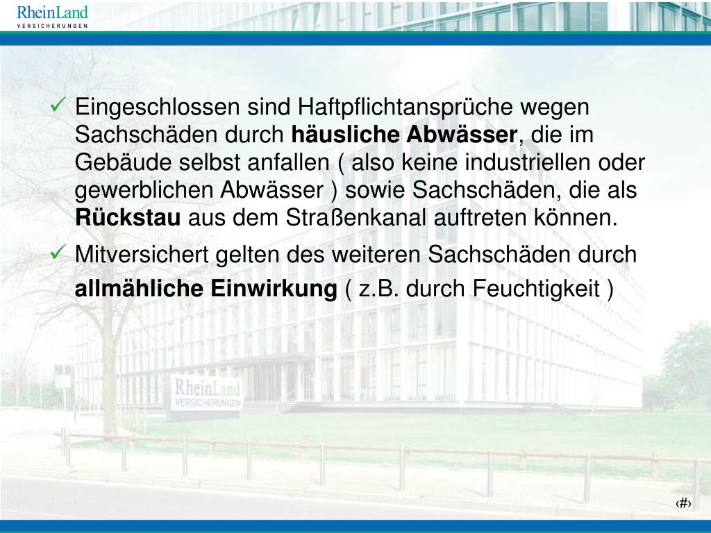 Eingeschlossen sind Haftpflichtansprüche wegen Sachschäden durch häusliche Abwässer, die im Gebäude selbst anfallen ( also keine industriellen oder gewerblichen Abwässer ) sowie Sachschäden, die als Rückstau aus dem Straßenkanal auftreten können. • Mitversichert gelten des weiteren Sachschäden durch allmähliche Einwirkung ( z.B. durch Feuchtigkeit )