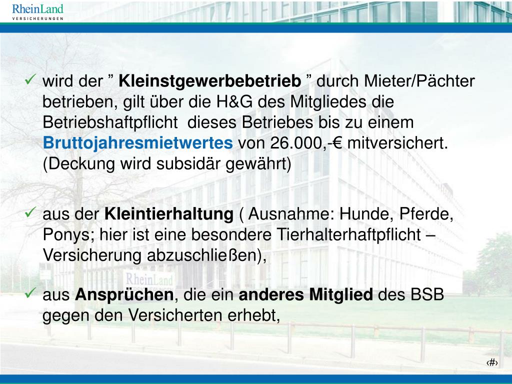 aus der Kleintierhaltung ( Ausnahme: Hunde, Pferde, Ponys; hier ist eine besondere Tierhalterhaftpflicht – Versicherung abzuschließen), • aus Ansprüchen, die ein anderes Mitglied des BSB gegen den Versicherten erhebt, • wird der ” Kleinstgewerbebetrieb ” durch Mieter/Pächter betrieben, gilt über die H&G des Mitgliedes die Betriebshaftpflicht dieses Betriebes bis zu einem Bruttojahresmietwertes von 26.000,-€ mitversichert. (Deckung wird subsidär gewährt)