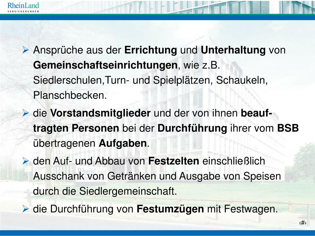 Welche Ansprüche sind versichert? • aus der Unterhaltung, Reinigung und Streupflicht der Wege und Straßen in und vor den Familienheimen, • Die Versicherung bezieht sich u.a. auch auf die gesetzliche Haftpflicht der Mitglieder, • aus der Reinigung, Unterhaltung und Erhaltung der Wohnung oder Teilen dieser Wohnung,