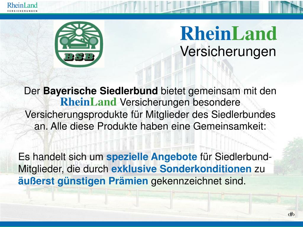 RheinLand Versicherungen Der Bayerische Siedlerbund bietet gemeinsam mit den RheinLand Versicherungen besondere Versicherungsprodukte für Mitglieder des Siedlerbundes an. Alle diese Produkte haben eine Gemeinsamkeit: Es handelt sich um spezielle Angebote für Siedlerbund-Mitglieder, die durch exklusive Sonderkonditionen zu äußerst günstigen Prämien gekennzeichnet sind.
