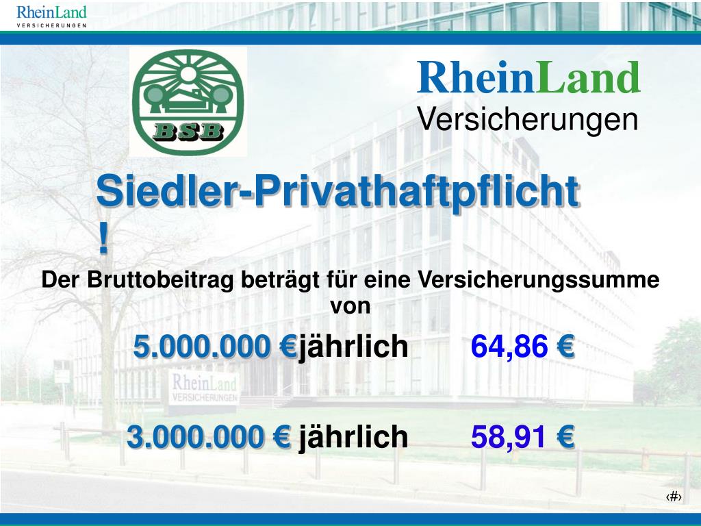 Siedler-Privathaftpflicht ! RheinLand Versicherungen Der Bruttobeitrag beträgt für eine Versicherungssumme von 5.000.000€jährlich 64,86€ 3.000.000€jährlich 58,91 €