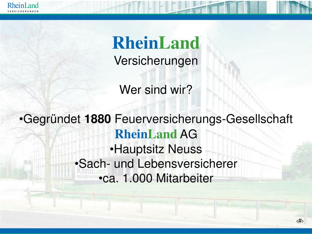 RheinLand Versicherungen Wer sind wir? • Gegründet 1880 Feuerversicherungs-Gesellschaft RheinLand AG • Hauptsitz Neuss • Sach- und Lebensversicherer • ca. 1.000 Mitarbeiter