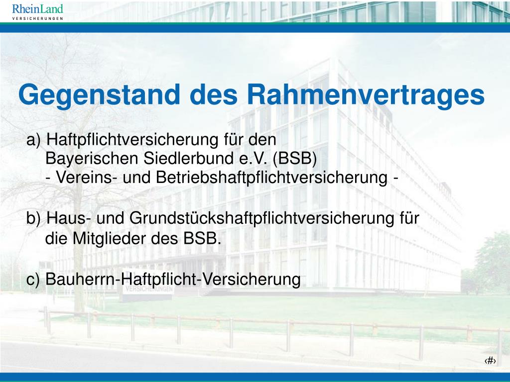 Gegenstand des Rahmenvertrages a) Haftpflichtversicherung für den Bayerischen Siedlerbund e.V. (BSB) - Vereins- und Betriebshaftpflichtversicherung - b) Haus- und Grundstückshaftpflichtversicherung für die Mitglieder des BSB. c) Bauherrn-Haftpflicht-Versicherung