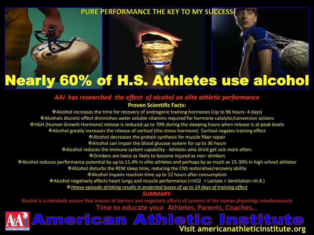 PURE PERFORMANCE THE KEY TO MY SUCCESS. Nearly 60% of H.S. Athletes use alcohol. AAI has researched the effect of alcohol on elite athletic performance Proven Scientific Facts: Alcohol increases the time for recovery of androgenic training hormones (Up to 96 hours- 4 days)