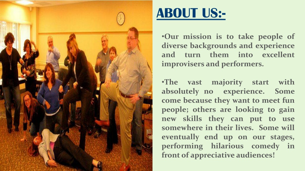 ABOUT US:- • Our mission is to take people of diverse backgrounds and experience and turn them into excellent improvisers and performers. • The vast majority start with absolutely no experience. Some come because they want to meet fun people; others are looking to gain new skills they can put to use somewhere in their lives. Some will eventually end up on our stages, performing hilarious comedy in front of appreciative audiences!
