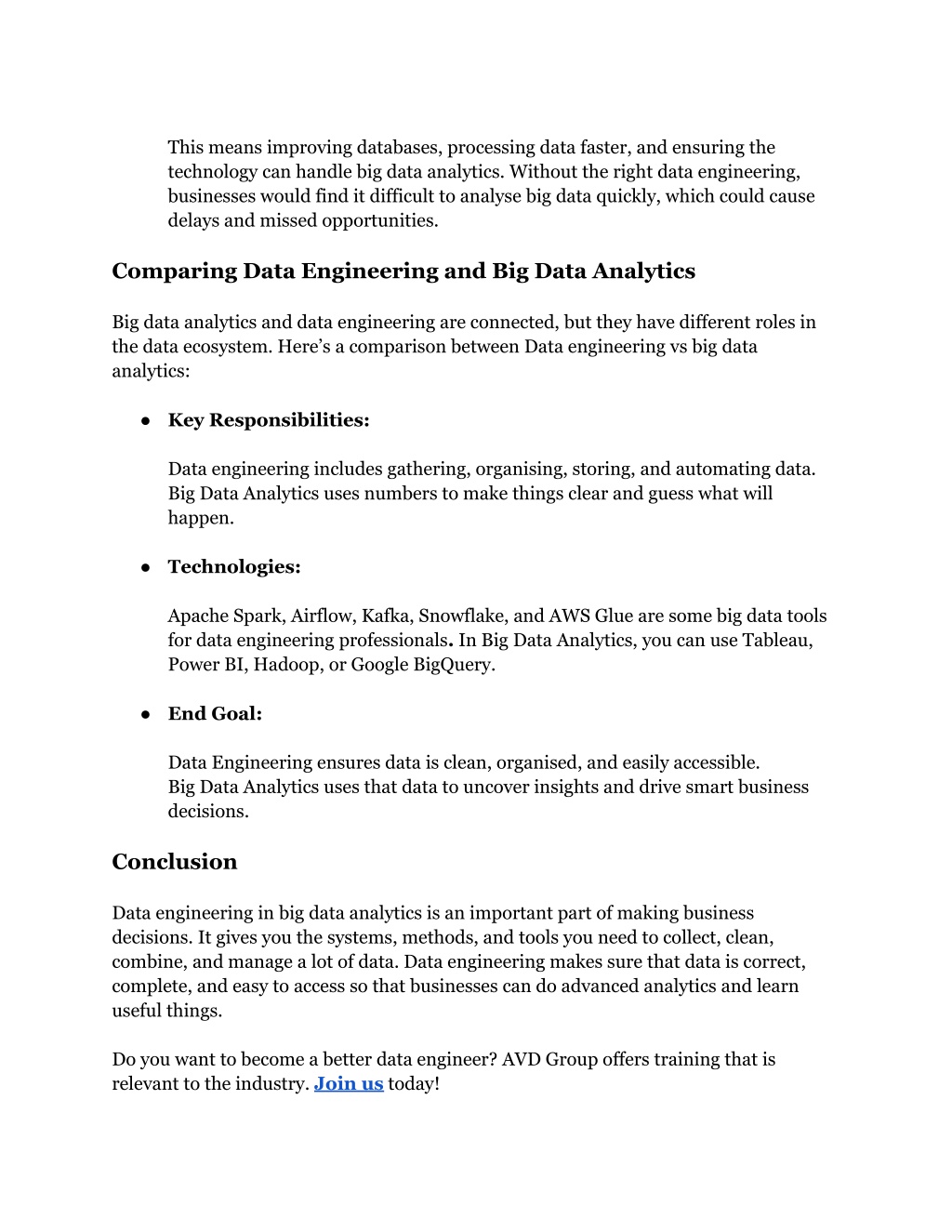 This means improving databases, processing data faster, and ensuring the technology can handle big data analytics. Without the right data engineering, businesses would find it difficult to analyse big data quickly, which could cause delays and missed opportunities. Comparing Data Engineering and Big Data Analytics Big data analytics and data engineering are connected, but they have different roles in the data ecosystem. Here’s a comparison between Data engineering vs big data analytics: ● Key Responsibilities: Data engineering includes gathering, organising, storing, and automating data. Big Data Analytics uses numbers to make things clear and guess what will happen. ● Technologies: Apache Spark, Airflow, Kafka, Snowflake, and AWS Glue are some big data tools for data engineering professionals. In Big Data Analytics, you can use Tableau, Power BI, Hadoop, or Google BigQuery. ● End Goal: Data Engineering ensures data is clean, organised, and easily accessible. Big Data Analytics uses that data to uncover insights and drive smart business decisions. Conclusion Data engineering in big data analytics is an important part of making business decisions. It gives you the systems, methods, and tools you need to collect, clean, combine, and manage a lot of data. Data engineering makes sure that data is correct, complete, and easy to access so that businesses can do advanced analytics and learn useful things. Do you want to become a better data engineer? AVD Group offers training that is relevant to the industry. Join us today!
