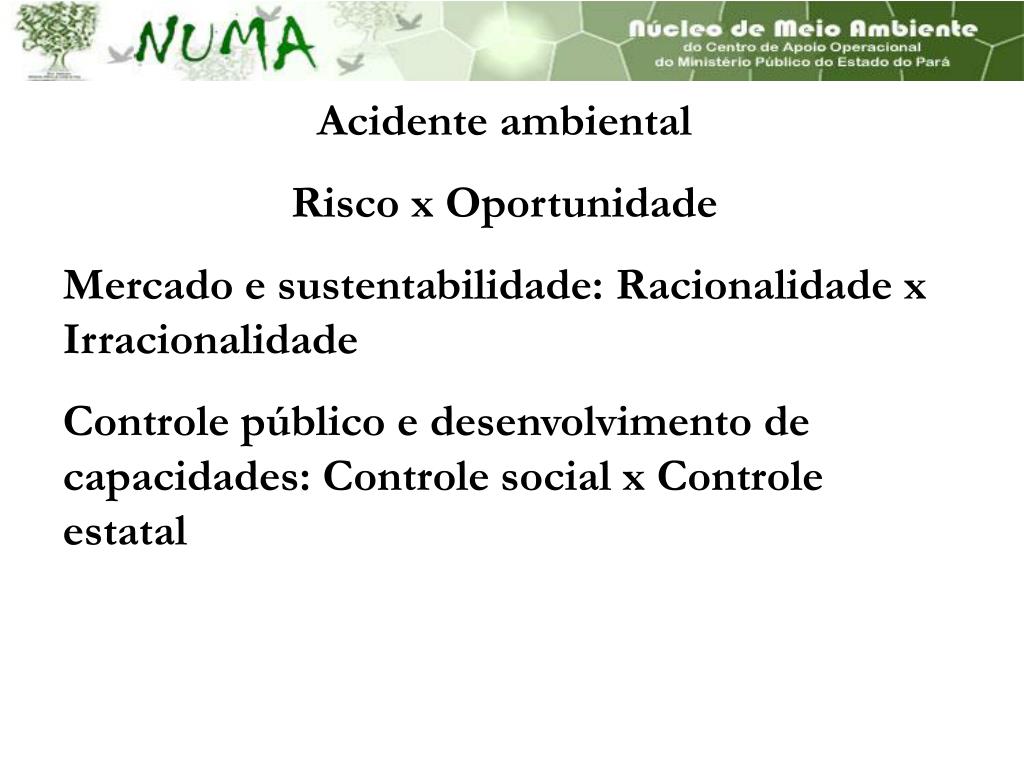 Acidente ambiental Risco x Oportunidade Mercado e sustentabilidade: Racionalidade x Irracionalidade Controle público e desenvolvimento de capacidades: Controle social x Controle estatal