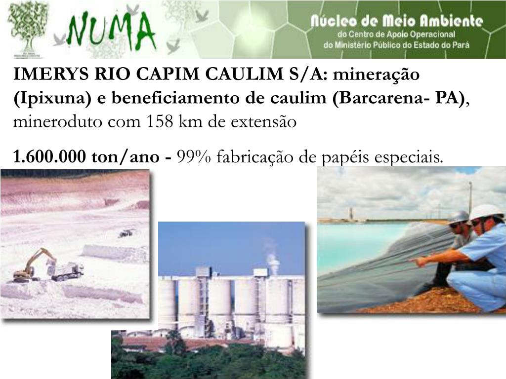 IMERYS RIO CAPIM CAULIM S/A: mineração (Ipixuna) e beneficiamento de caulim (Barcarena- PA), mineroduto com 158 km de extensão 1.600.000 ton/ano - 99% fabricação de papéis especiais.