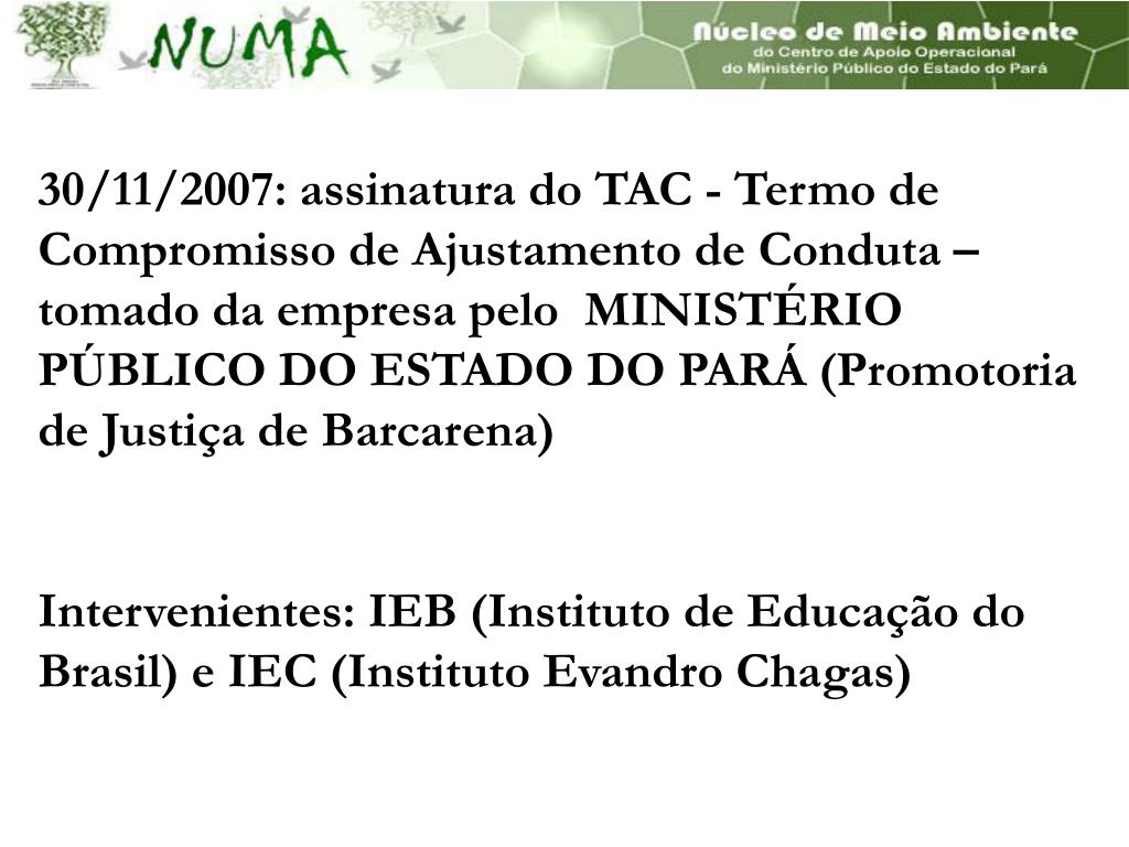 30/11/2007: assinatura do TAC - Termo de Compromisso de Ajustamento de Conduta – tomado da empresa pelo MINISTÉRIO PÚBLICO DO ESTADO DO PARÁ (Promotoria de Justiça de Barcarena) Intervenientes: IEB (Instituto de Educação do Brasil) e IEC (Instituto Evandro Chagas)