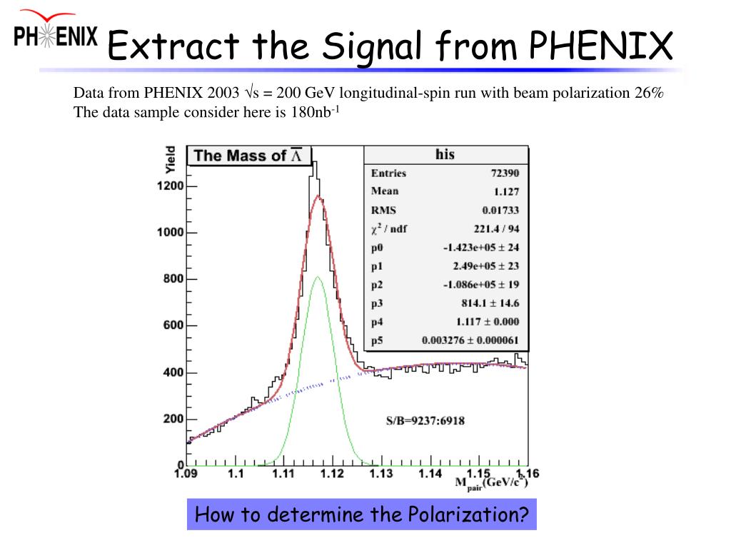 Extract the Signal from PHENIX Data from PHENIX 2003 s = 200 GeV longitudinal-spin run with beam polarization 26% The data sample consider here is 180nb-1 How to determine the Polarization?