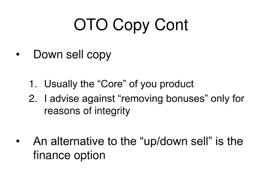 OTO Copy Cont • Down sell copy • Usually the “Core” of you product • I advise against “removing bonuses” only for reasons of integrity • An alternative to the “up/down sell” is the finance option